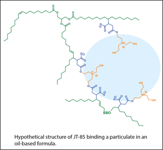 As an initial proof of concept, the maleated dispersant JT-85 was used to create a 40wt% mesotrione oil dispersion. Due to mesotrione’s low solubility in water and high propensity to degrade when dissolved, JT-85 represents an excellent case where an anhydrous oil dispersion is greatly preferred over an aqueous system. Dispersing mesotrione in oil can be a challenging proposition, but at a relatively low rate of only seven percent, JT-85 was able to make a stable oil dispersion. By comparison, more typical dispersant chemistries such as EO/PO block copolymers, tristyrenated phenol alkoxylates, acrylate comb polymers, alcohol ethoxylate phosphates, and sulfates all failed to produce viable formulas. Our expectation is that this is the first of many examples of maleated dispersants—enabling the production of new and challenging dispersant formulations.